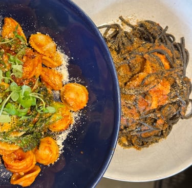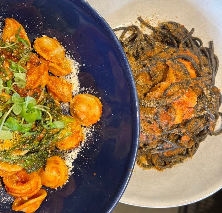 Proseguiamo con le orecchiette, rapini (rape) e Nduja, terminiamo con uno spaghetto al nero di seppia, gamberi, Nduja e pomodoro, che ci crediate o no, é stato un piatto da leccarsi i baffi.