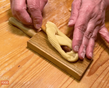 Con un coltello liscio, ritagliamo un pezzo di impasto e lavorandolo con le mani, creiamo delle strisce sottili.
